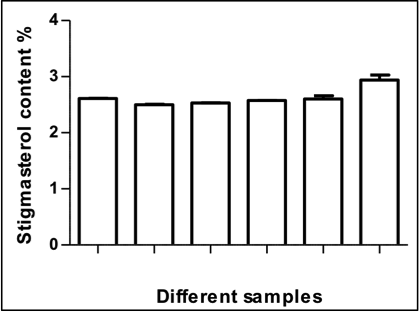 Stigmasterol extraction and Quantification by High Performance Thin Layer Chromatography (HPTLC)HPTLC analysis was carried out in the Anchrome Pvt. Ltd, Mulund, Mumbai .All the prepared samples were subjected for HPTLC analysis with that standard reference compound of Stigmasterol. Merck Silica gel 60 F254 TLC was used as a stationary phase while Toluene: Ethyl acetate: Methanol (7:1:0.5,) was used as mobile phase. Camag Scanner IV equipped with win CATS Planar Chromatography manager software version 1.4.7 equipment was used for HPTLC spectral studies at 366 nm wavelength. 10 % Methanolic sulphuric acid was used as derivatizing agent while nitrogen was used as carrier gas.