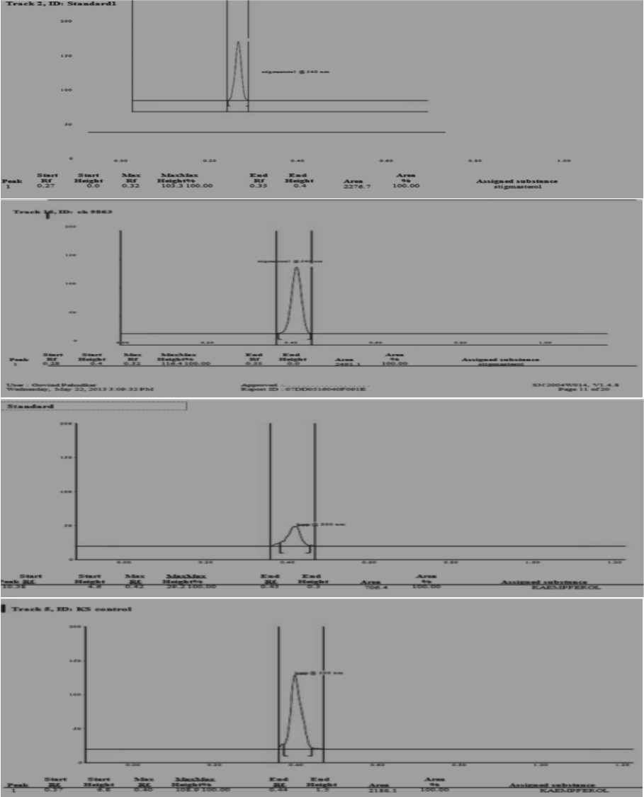 Kaempferol extraction and its Quantification by High Performance Liquid Chromatography (HPTLC) analysisThe 6 varieties of Cow pea were powdered and subjected for Kampferol extraction by using the methanol cold extraction method at room temperature. The extracts were dried in vacuo and subjected for its Kaempferol content analysis by using HPTLC spectral studies separately with standard reference compound of Kaempferol. HPTLC analysis was carried out in Anchrom Test Lab Pvt. Ltd using silica gel plates (60F254 Manufacturer E. MERCK KGaA). Sample application was carried out on CAMAG Linomat 5 Instrument (CAMAG Linomat 5 "Linomat5_080222" S/N 080222). Inert gas was used as spray gas. Sample solvent type was methanol. Dosage speed was 150nl/s and syringe size was 100µl and the analysis wave length was 430 nm. Toluene: Ethyl acetate: Diethyl amine (14:2:2) was used as mobile phase.