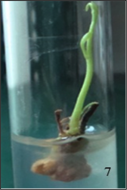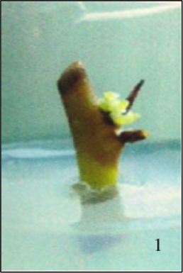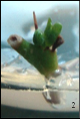 1. Direct regeneration of shoot:Direct regeneration of shoot was observed in 0.5 mg/l IAA + 2 mg /l and 0.5 mg/l IAA +3 mg /l kinetin. (Better regeneration of shoot was observed at 3 mg/1 kinetin induction.(Figure-1). .Regeneration of shoot was initiated after 6 weeks of incubation A similar observation was reported in the earlier literature [21], where 2mg/l kinetin was sufficient to induce shoots without calli formation. On the contrary the proliferation of shoot from axillary buds at 1 mg/l kinetin was also reported [22]. Shoot induction was observed in cotyledonary explants at 0.2 mg/l IAA and 1.5 mg/L BA [23].