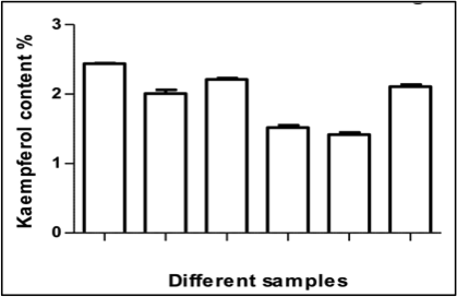 Kaempferol extraction and its Quantification by High Performance Liquid Chromatography (HPTLC) analysisThe 6 varieties of Cow pea were powdered and subjected for Kampferol extraction by using the methanol cold extraction method at room temperature. The extracts were dried in vacuo and subjected for its Kaempferol content analysis by using HPTLC spectral studies separately with standard reference compound of Kaempferol. HPTLC analysis was carried out in Anchrom Test Lab Pvt. Ltd using silica gel plates (60F254 Manufacturer E. MERCK KGaA). Sample application was carried out on CAMAG Linomat 5 Instrument (CAMAG Linomat 5 "Linomat5_080222" S/N 080222). Inert gas was used as spray gas. Sample solvent type was methanol. Dosage speed was 150nl/s and syringe size was 100µl and the analysis wave length was 430 nm. Toluene: Ethyl acetate: Diethyl amine (14:2:2) was used as mobile phase.