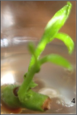 1. Direct regeneration of shoot:Direct regeneration of shoot was observed in 0.5 mg/l IAA + 2 mg /l and 0.5 mg/l IAA +3 mg /l kinetin. (Better regeneration of shoot was observed at 3 mg/1 kinetin induction.(Figure-1). .Regeneration of shoot was initiated after 6 weeks of incubation A similar observation was reported in the earlier literature [21], where 2mg/l kinetin was sufficient to induce shoots without calli formation. On the contrary the proliferation of shoot from axillary buds at 1 mg/l kinetin was also reported [22]. Shoot induction was observed in cotyledonary explants at 0.2 mg/l IAA and 1.5 mg/L BA [23].