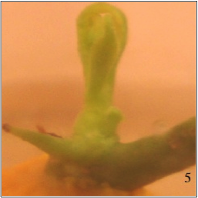 2. Agrobacterium mediated induction:The nodal explants of 4 week old plant was co-cultured with Agrobacterium rhizogenes after an incubation of 5, 10, 15, 20 and and 25 minutes and transferred to MS agar. After 3 days of incubation direct shoot regeneration was observed in 5, 10 and 15 minutes incubated explants. After 3 weeks of incubation shoot growth increased and tumor induction was observed in 5 and 10 min incubated explants instead of rooting (Figure-1).