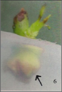 6-7: Agrobacterium rhizogenes mediated tumour induction after 3weeks in 5 and 10 min exposure of co-cultivation.